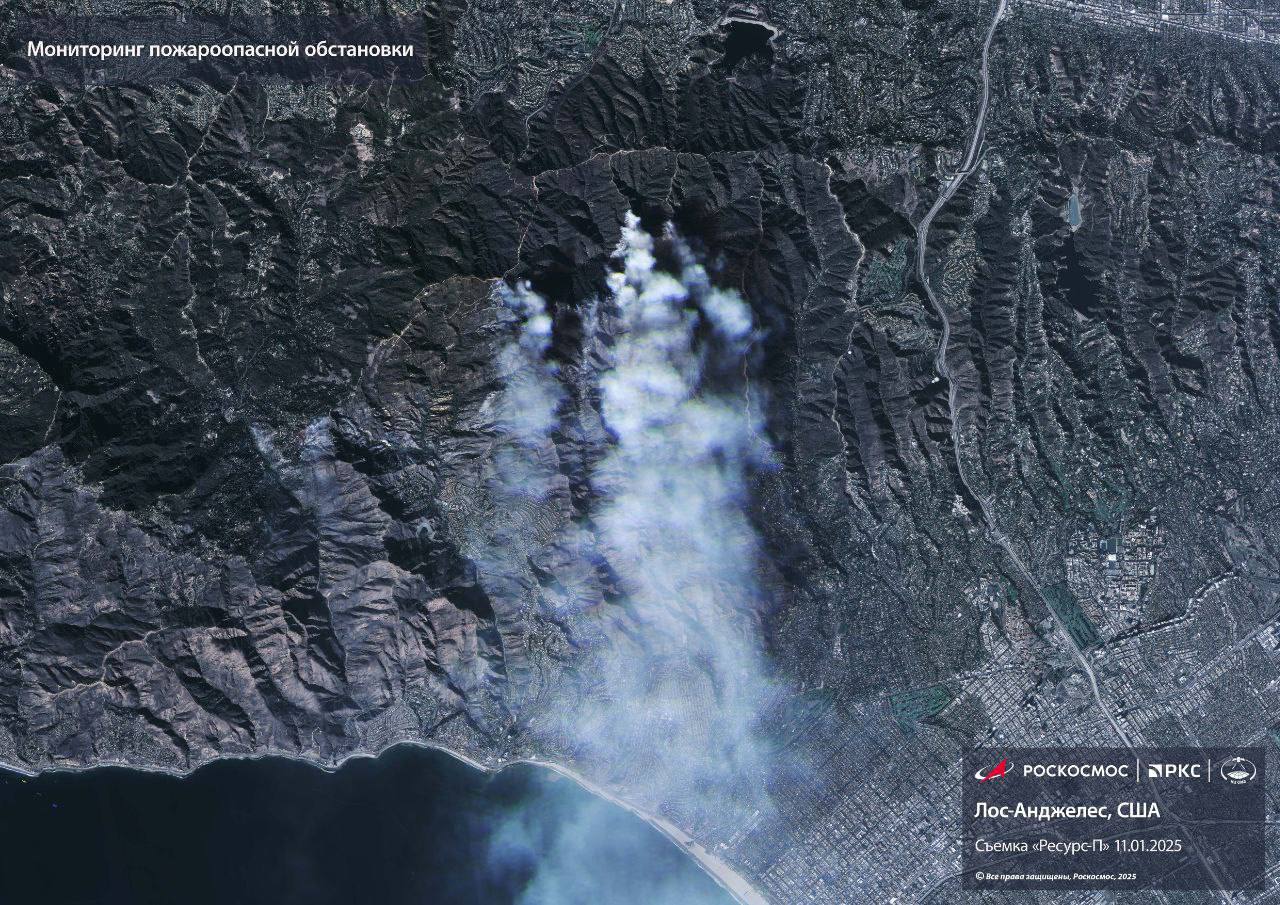 Роскосмос сегодня опубликовал новые снимки со спутника «Ресурс-П», который запечатлел пожар и дым над Лос-Анджелесом.