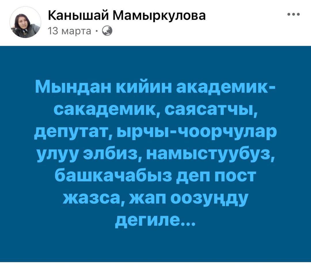 Адвокат Нурбек Сыдыков ранее проинформировал, что Канышай Мамыркулову обвиняют в «призывах к массовым беспорядкам» (статья 278 УК КР). Ее задержали на 48 часов. Он отметил, что сотрудники правоохранительных органов проверяли публикации активистки в социальных сетях.