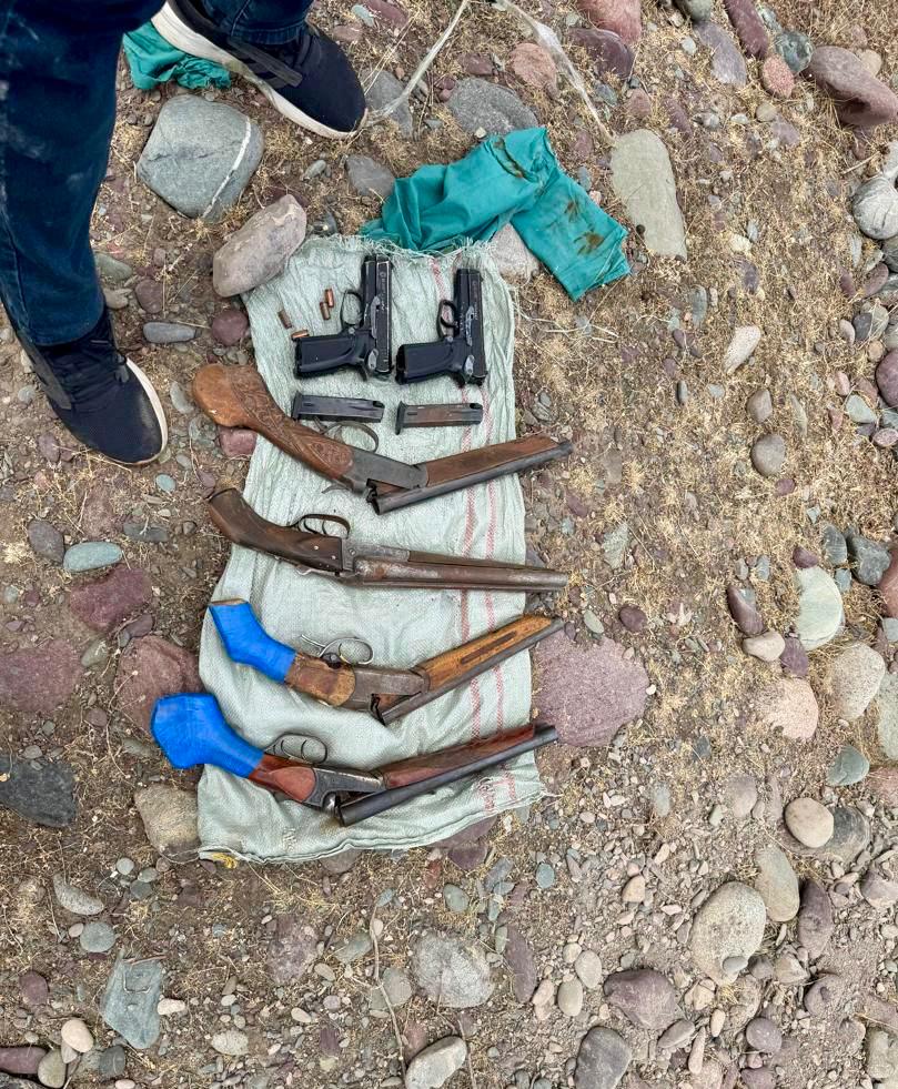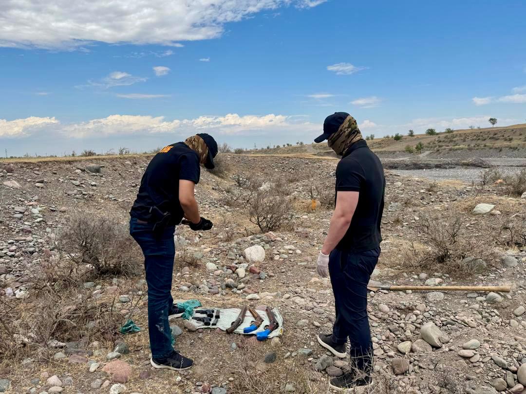 Схрон оружия был обнаружен на территории южной части поймы реки Кара-Балты Жайылского района Чуйской области. Четыре обреза, два газотравматических пистолета и боеприпасы к ним были изъяты.