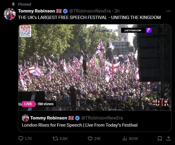 «Более трх миллионов патриотов вышли на улицы в центре Лондона, показав беспрецедентную мощь патриотизма. И это только начало», — написал он в своем Telegram-канале.