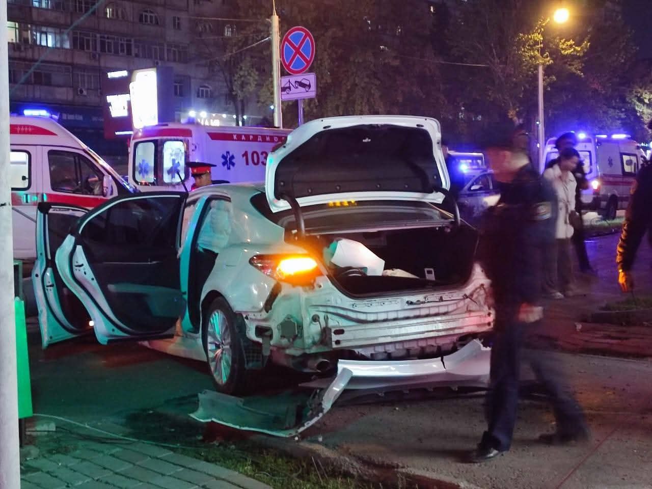 По их данным, авария произошла на пересечении улиц Абдрахманова и Боконбаева. По предварительной информации, один из автомобилей двигался с большой скоростью, а в это время другая легковушка хотела проехать на мигающий зеленый сигнал светофора. В результате две машины столкнулись. Одно из авто от удара отбросило в сторону. Удар был такой силы, что машина снесла светофор и фонарный столб.