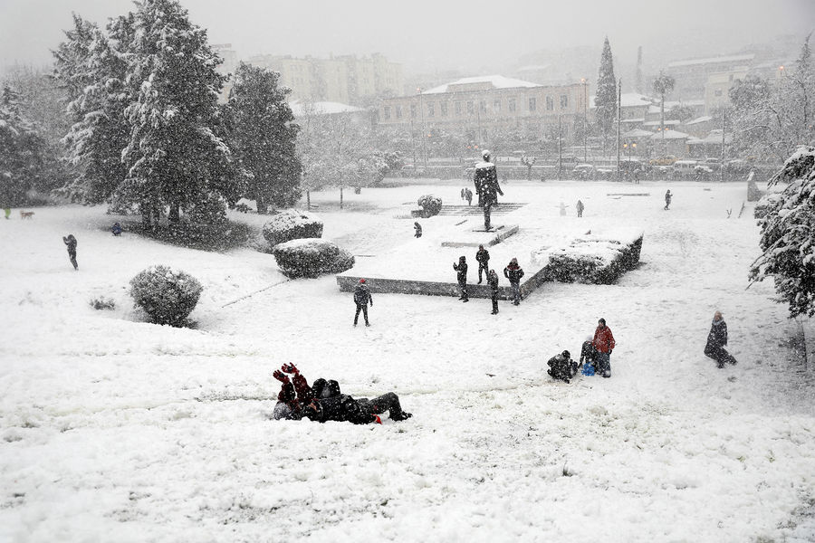 Сильный снегопад привел к закрытию учебных заведений в 14 провинциях, а дети превратили вынужденные каникулы в игры: некоторые катались с горок на пластиковых пакетах.