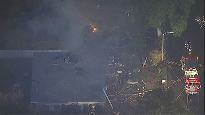 После аварии в двух частных домах, на которые рухнул самолет, вспыхнул пожар. Огонь распространился и на соседнее жилое здание. Тушение продолжается.