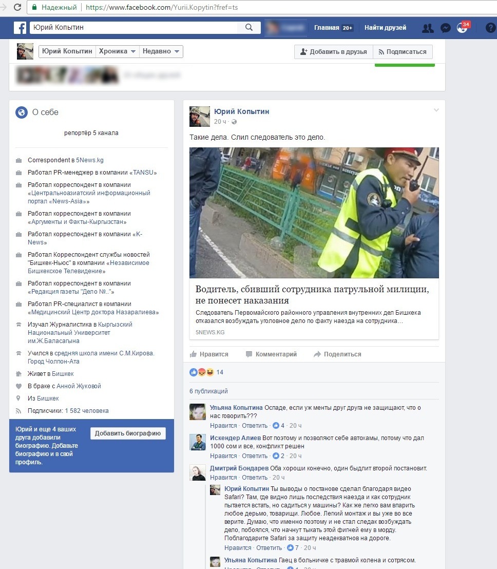 «Закон суров, но он закон. Некоторые представители закона трактуют закон в сторону своей личной прибыли. Вот результат, когда за человека, исполняющего свои обязанности, даже в соцсети, мягко говоря, мало кто вступился», — написал пользователь Facebook Таалайбек Закиров.