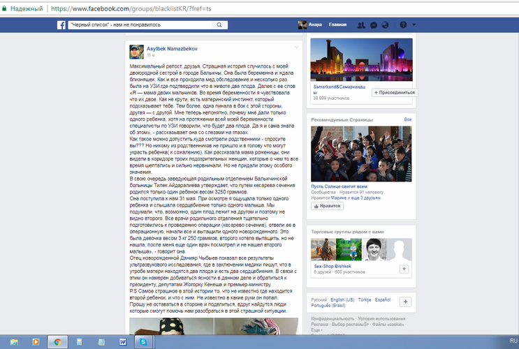 «Страшная история случилось с моей двоюродной сестрой в городе Балыкчи. Она была беременна и ждала близняшек. Как и все, проходила медицинское обследование и несколько раз была на УЗИ, где подтвердили, что в животе два плода. Далее, с ее слов: «Я — мама двоих мальчиков. Во время беременности я чувствовала, что их двое. Как ни крути, есть материнский инстинкт, который подсказывает тебе. Тем более, один пинал в бок с этой стороны, второй — с другой. Мне теперь непонятно, почему мне дали только одного ребенка, хотя на протяжении всей моей беременности специалисты по УЗИ говорили, что будет два плода. Да я и сама знала об этом», — пишет пользователь.