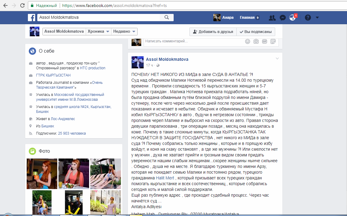 В Анталье 12 июля состоялся суд по делу о покушении на жизнь гражданки Кыргызстана Малики Нотиевой. Интересы девушки представляли три адвоката. Обвиняемым по делу проходит 49-летний отец четверых детей Мустафа Йылдыз, 1968 года рождения, зверски избивший девушку. Из-за отказа в интимной близости он проломил ей голову и выбросил из автомобиля на большой скорости. Об этом сообщила на своей странице в социальной сети Facbook телеведущая Ассоль Молдокматова.