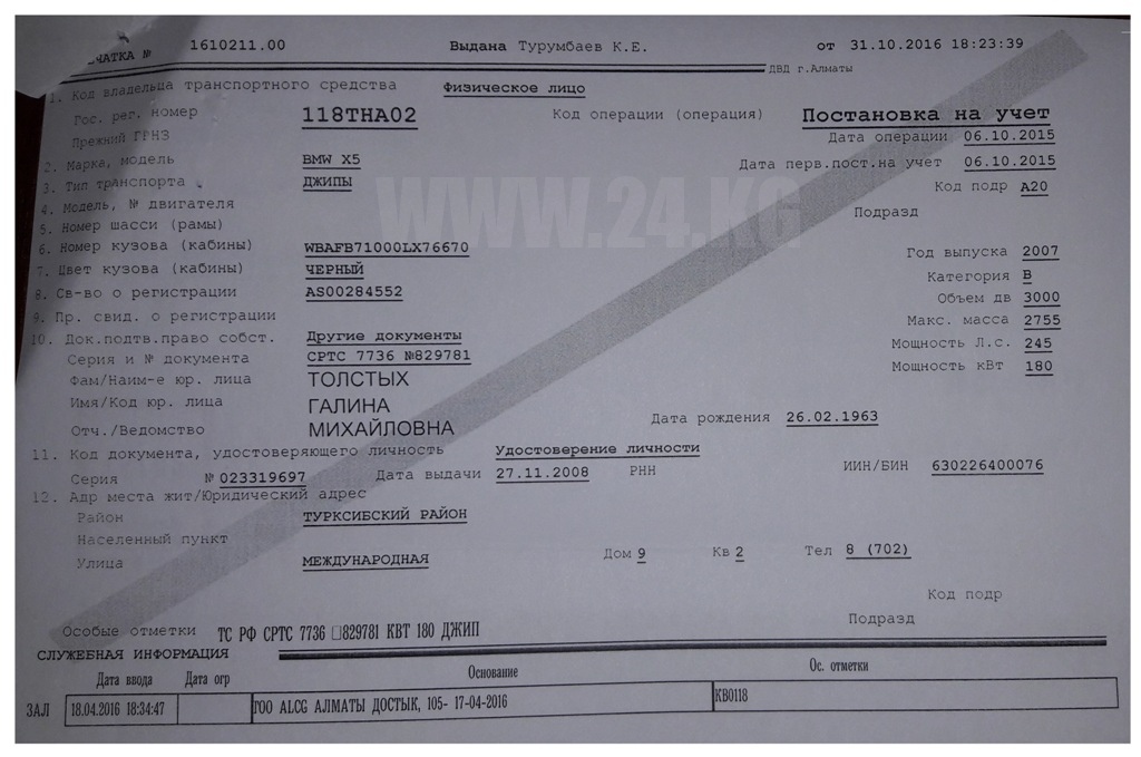По данным Департамента регистрации транспортных средств и водительского состава по Сокулукскому району, BMW-X5 до сих пор принадлежит гражданину КР. Автомобиль не заложен и не арестован.