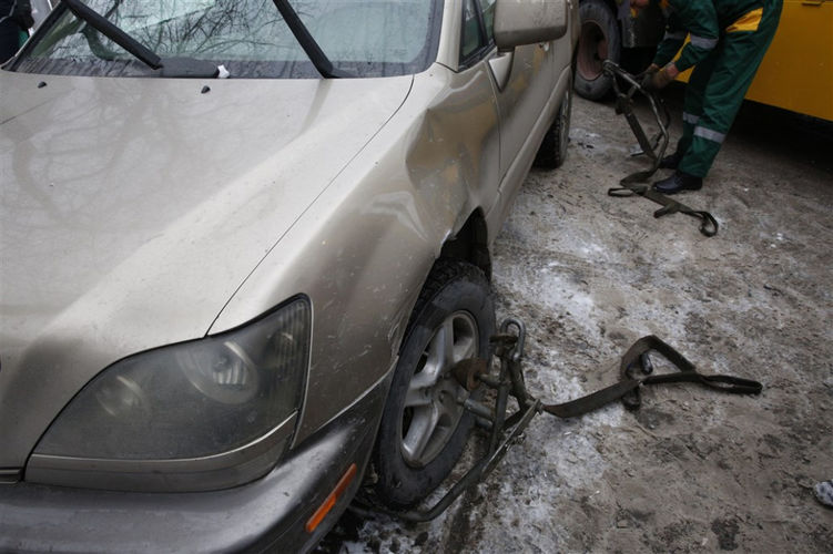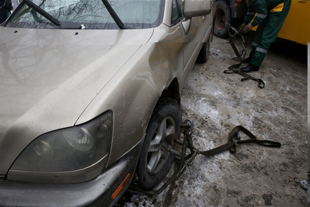 При поднятии внедорожника одно из креплений на переднем колесе сорвалось и помяло переднее и заднее крылья иномарки. После неудачной попытки эвакуатор оставил машину на месте и уехал. Примерно через час на место приехал другой эвакуатор. Со второй попытки легковушку погрузили и увезли на штрафстоянку.