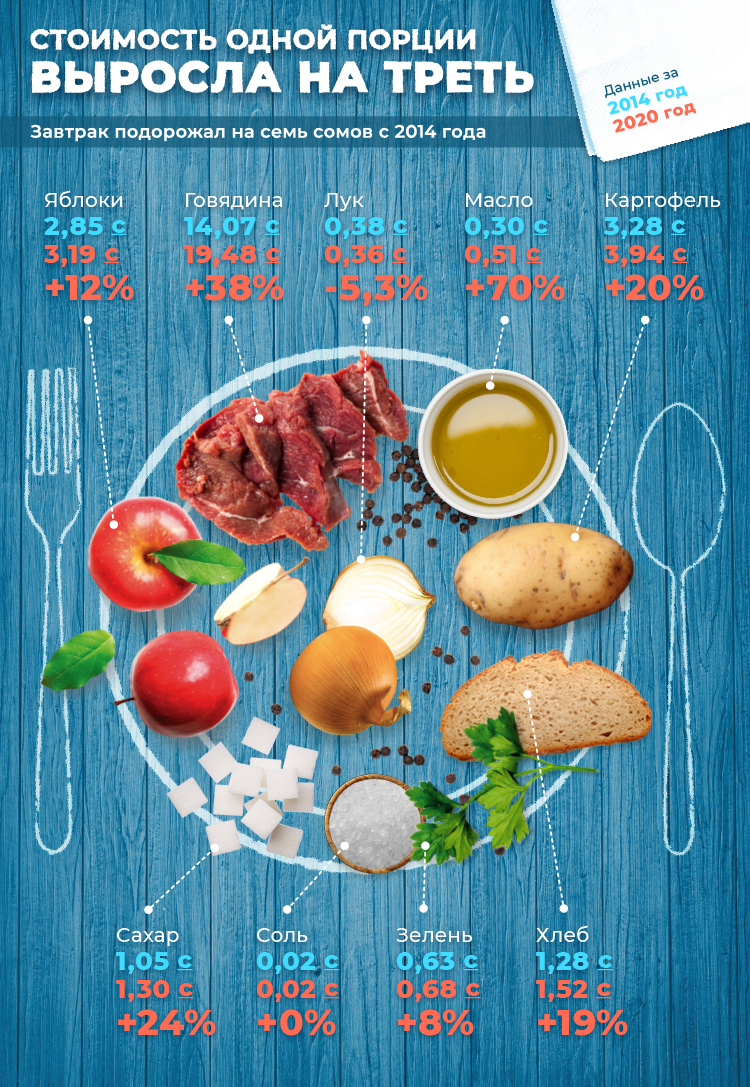 Мы посчитали, сколько стоили продукты для рагу (куурдака), хлеба и компота в 2014 и 2020 годах, чтобы узнать, насколько выросла реальная стоимость обеда за те семь лет, в течение которых государство не повышало расходы на программу школьного питания. Для этого мы взяли среднегодовые цены на продукты, которые публикует Национальный статистический комитет.