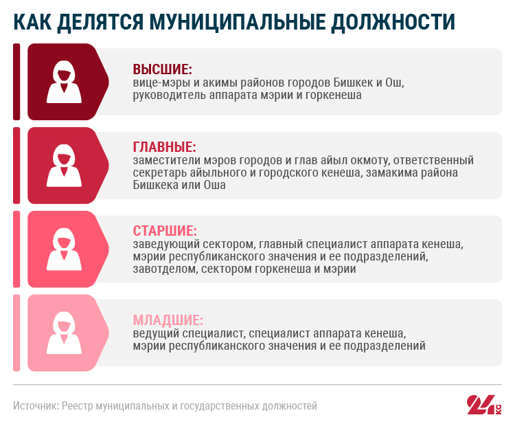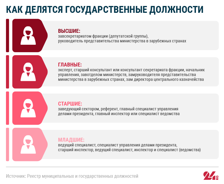 В системе местных органов власти все административные должности делятся на четыре типа: высшие, главные, старшие и младшие. Больше всего власти и возможностей принимать решения у сотрудников на высших и главных должностях.