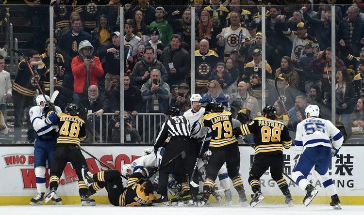 В матче регулярного чемпионата НХЛ между «Тампа Бэй Лайтнинг» и «Бостон Брюинз» произошла массовая драка с участием 10 хоккеистов. Об этом сообщило РИА Новости.