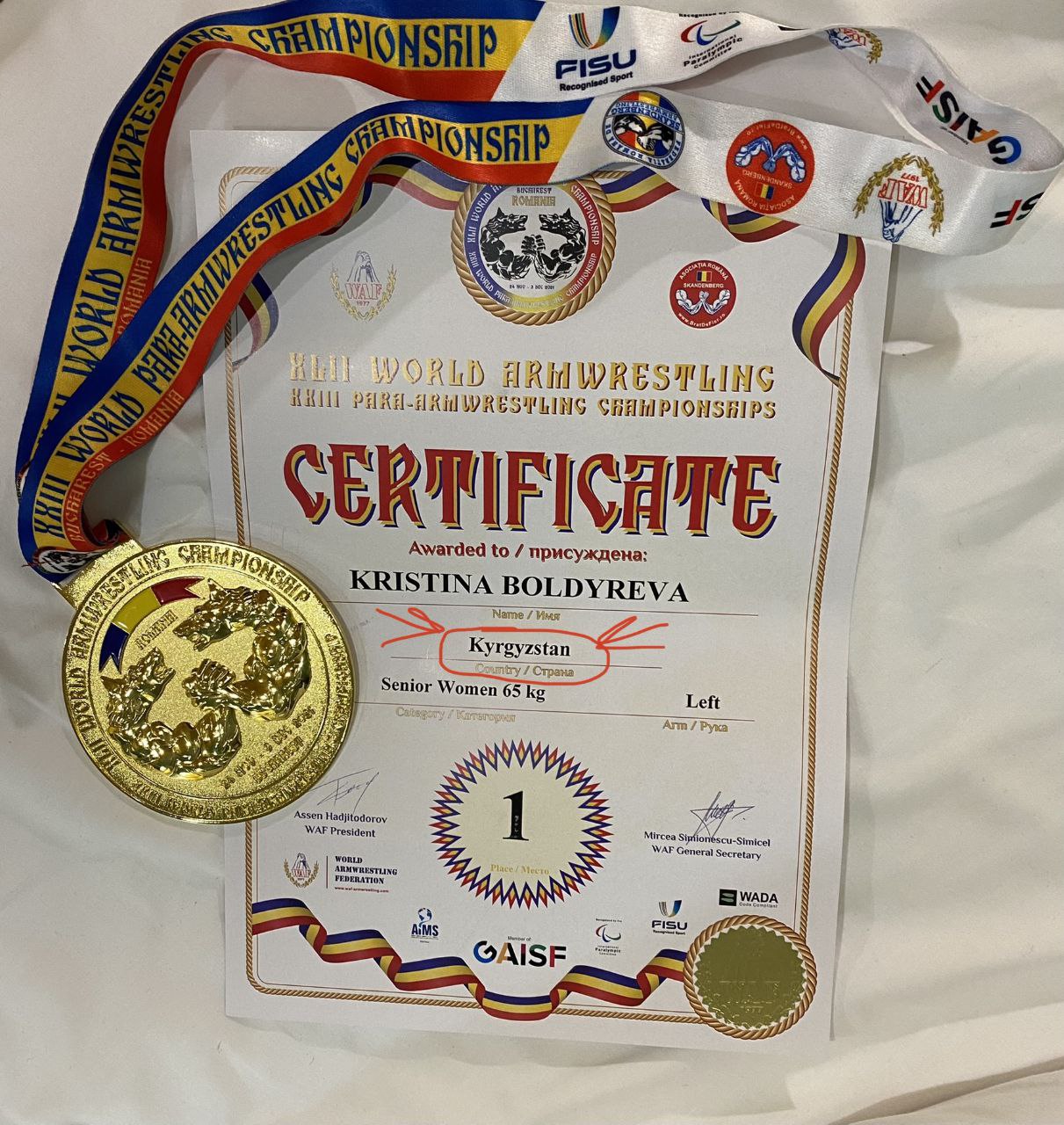 На днях стало известно, что чемпионку мира по армрестлингу — 31-летнюю Кристину Болдыреву лишили права выступать за Кыргызстан. Скандал произошел на недавнем чемпионате мира в Румынии. Она выиграла золотую медаль в категории «сеньоры» в весе 65 килограммов (левая рука). Однако во время награждения на пьедестале оказалась без флага Кыргызстана.