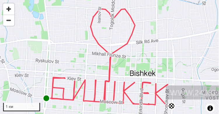 Бишкекчанин Евгений Витковский совершил необычный велозаезд, посвященный 145-летию города. С помощью специального приложения и GPS-трекера он написал на карте «Я люблю Бишкек».
