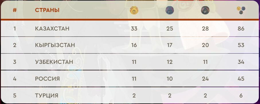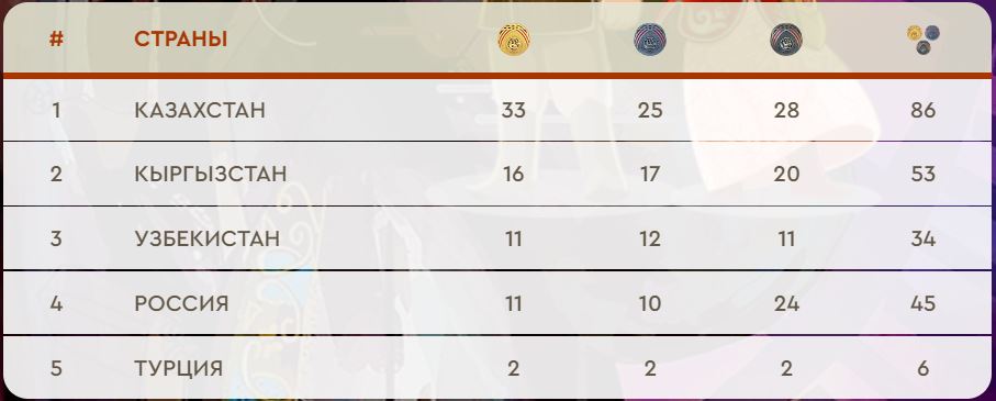 Среди медалей у КР награды в кок бору, кокпаре, овари, ашыртмалы аба гюреши, тенге алу, мас-рестлинге, аударыспаке, стрельбе из лука, алыше и куреше.
