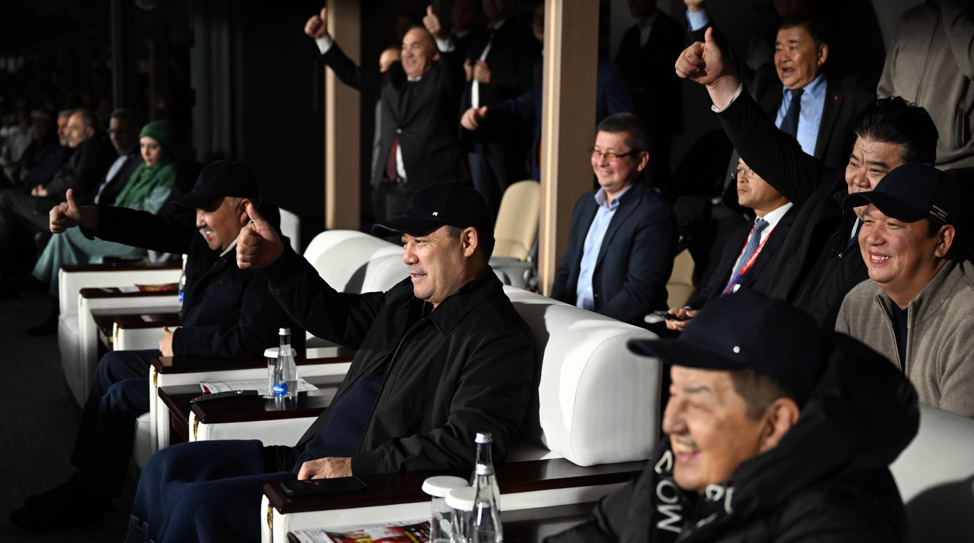 Президент Садыр Жапаров, торага Жогорку Кенеша и глава кабинета министров наблюдали за игрой с трибун.