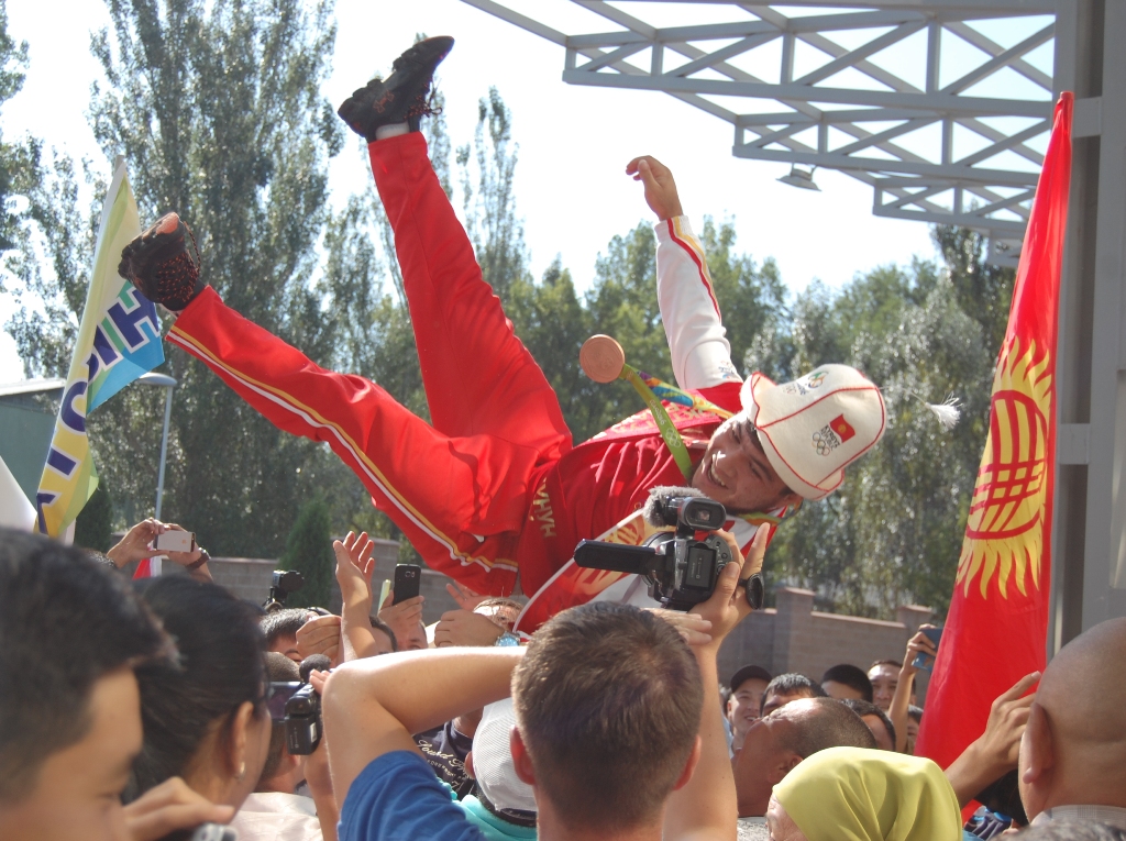 На фото – народ качает Иззата Артыкова, радуясь олимпийской «бронзе» (за шесть дней до дисквалификации).