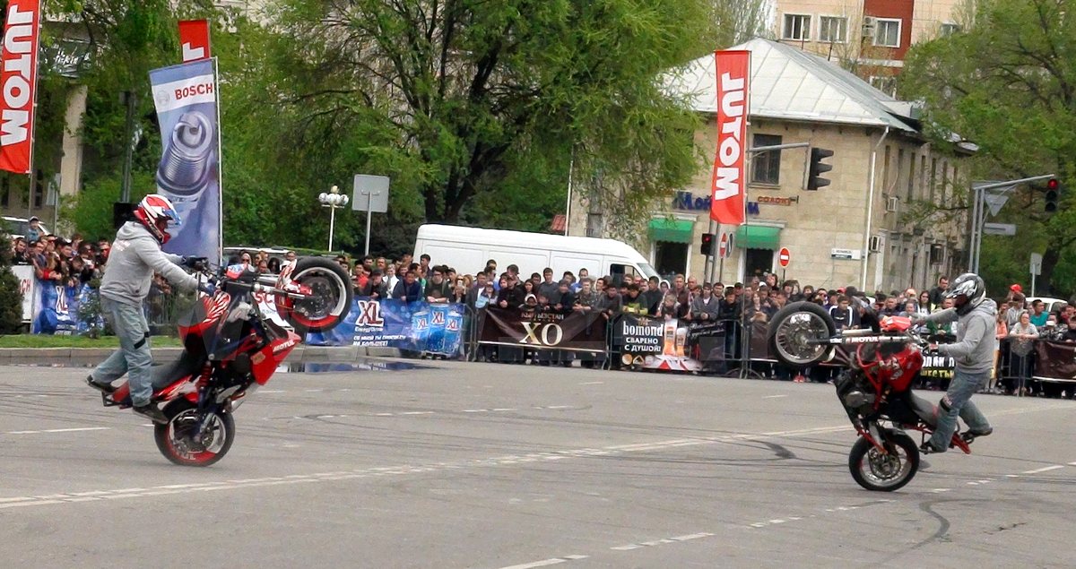 На площади Победы организаторы устроили шоу. Вначале — конкурс «Самый медленный». Суть — занять последнее место в заезде. Оказалось, медленно ехать на мотоцикле не так уж просто! Потом на площадку выехали два автомобилиста-дрифтера и продемонстрировали искусство управляемого заноса. Испытывали покрышки до тех пор, пока те не лопнули.