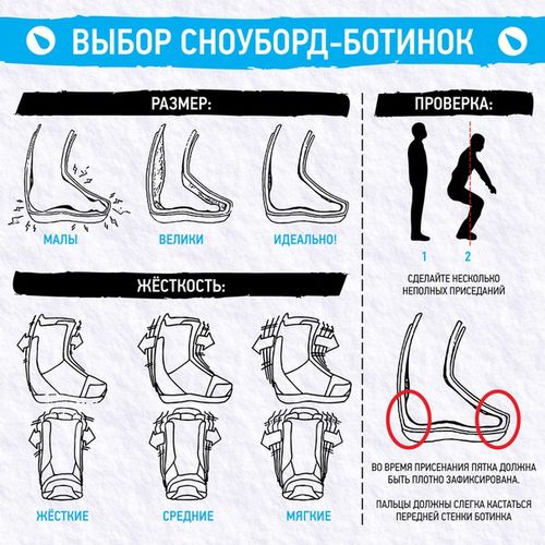 - Ботинки для новичков лучше брать мягкие. Не надейтесь с первой примерки найти «свою» пару. Многие современные модели предполагают термоформовку — специальную подгонку под анатомические особенности конкретного человека.