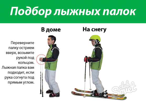 - Следующий этап — лыжные палки. Рекомендуется выбирать палки, у которых петли для рук надежно застегиваются на липучку. Не стоит брать палки с маленькими опорными кольцами (лапками). Они будут проваливаться в снег, потому что предназначены для специальных трасс.