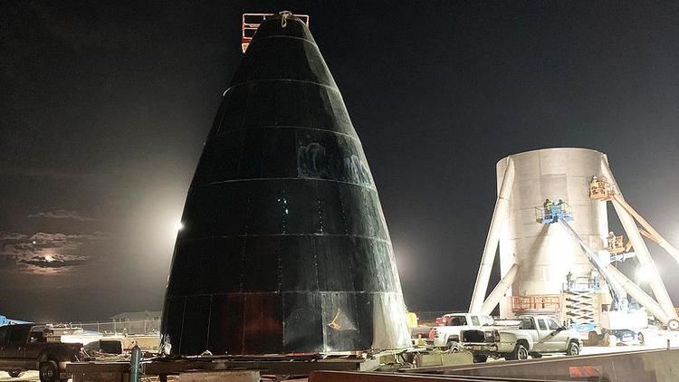 Фотография сделана в испытательном центре компании в Южном Техасе. На ней видны две части корабля из нержавеющей стали: коническое сечение и цилиндрический блок с посадочными ножками.