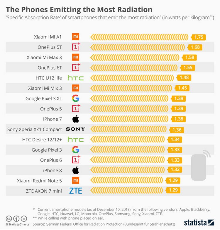 Хотя не существует универсального руководства по безопасному уровню излучения смартфона, немецкие специалисты, пользуясь критериями сертификата Blue Angel, который подтверждает экологическую безопасность устройства, сертифицируют только телефоны с удельным коэффициентом поглощения электромагнитного излучения 0,6 ватта на килограмм. Вошедшие в перечень Statista смартфоны показывают более чем двукратное превышение показателя.