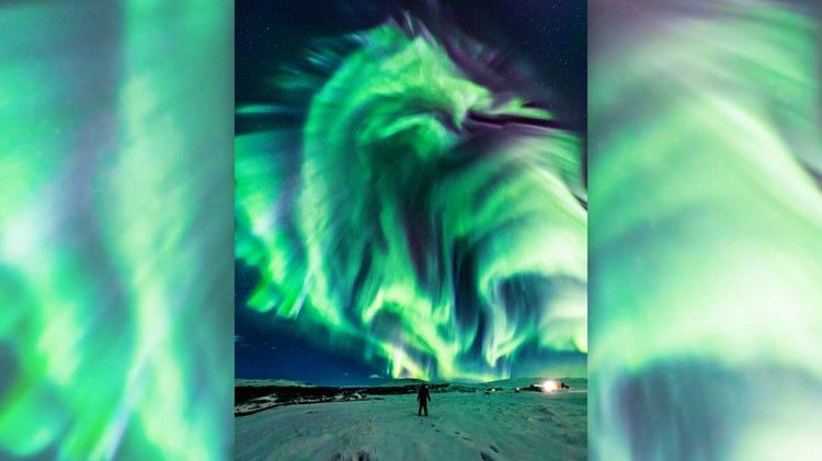 На фотографии, сделанной в небе над Исландией, можно легко разглядеть голову дракона, крылья и даже фиолетовое пламя, вылетающее из пасти. Об этом сообщил портал @hi-tech.