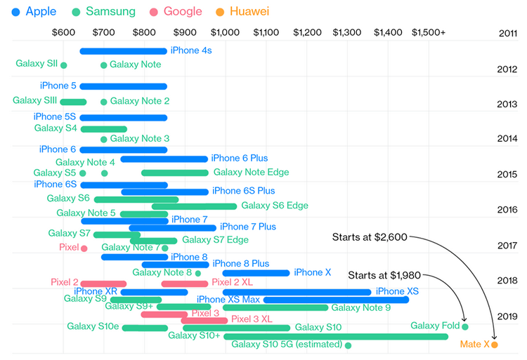 Последняя премьера Huawei — раскладной Mate X — будет стоить около $2 тысяч 600. Но динамику цен по китайской компании Bloomberg не представил.