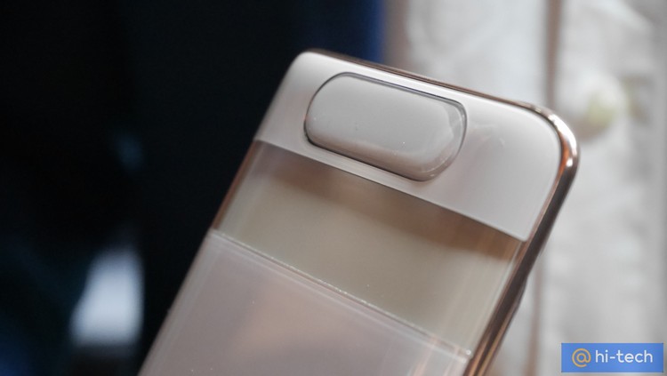 Камера выезжает из верхней части корпуса Galaxy A80, а внутри модуля она может вращаться. Это помогло избавиться от ограничения фронтальных камер, которые в смартфонах снимают хуже основной. Камера поворачивается в нужную сторону в зависимости от задачи — снять что-то или сделать селфи.