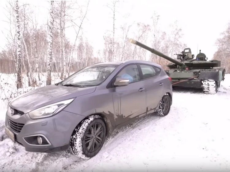 Состязание устроили на заснеженной грунтовой дороге в Омской области. На бездорожье у Hyundai не было бы шансов, а так осталась какая-то видимость преследования на скорости 70 километров в час. Когда Т-80 резко остановился, иномарка, пытаясь сделать то же, улетела в придорожный сугроб. Танк же ее и вытащил.