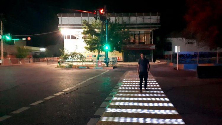 Необычную зебру разработали именно в Сарыагаше. Пешеходный переход подсвечивается с помощью специальных датчиков. Цифровая система срабатывает автоматически.