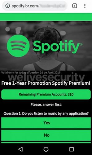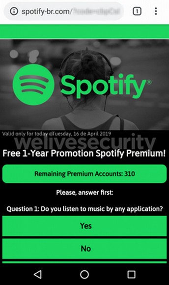 Потенциальная жертва получает сообщение в WhatsApp с предложением стать премиум-подписчиком Spotify на год. Перейдя по ссылке, человек попадает на фишинговый сайт со специальной анкетой. Адрес страниц и ее оформление схожи с официальным сайтом Spotify.