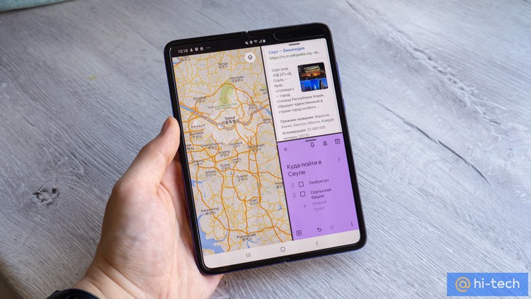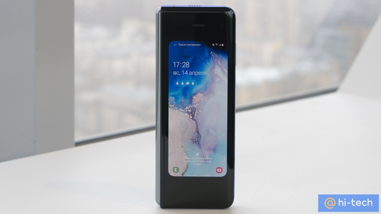 Основной экран Galaxy Fold имеет диагональ 7,3 дюйма и 2K-разрешение, по соотношению сторон он близок к квадрату — 4,2:3. В сложенном состоянии превращается в телефон с небольшим 4,6-дюймовым дисплеем и разрешением HD+. Дополнительный экран оказался очень длинным из-за соотношения сторон 21:9, такой формат используют в кино.