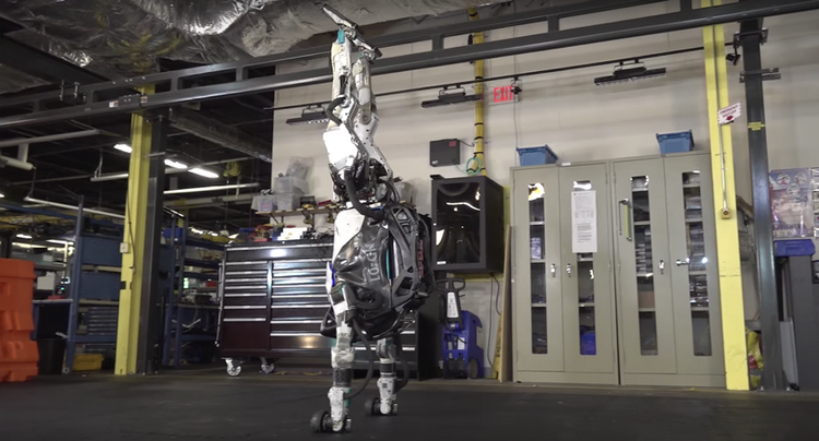 Atlas выполнил несколько простых заданий: стойку на руках, прыжок с оборотом на 360 градусов и прыжок с поднятием ног в разные стороны. Робот делал все упражнения в общей последовательности.