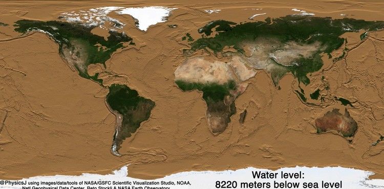 Как только океаны мелеют на 6 тысяч метров, большая часть воды на Земле исчезает. Однако требуется почти еще 5 тысяч метров, чтобы осушить дно полностью, включая Марианскую впадину.