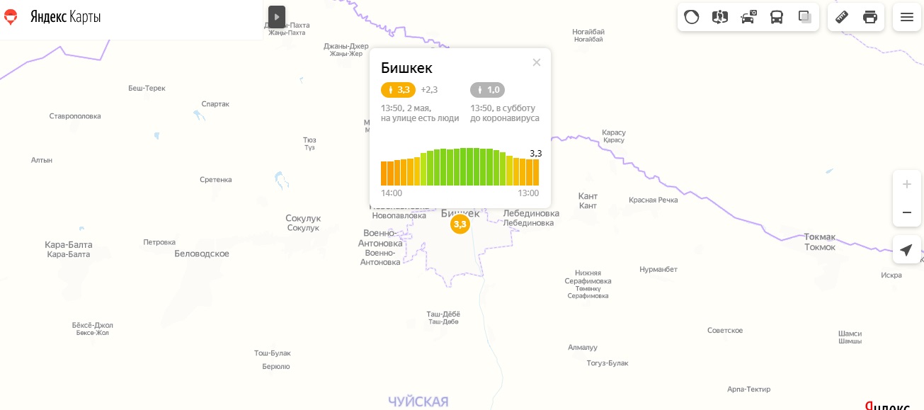 Уровень индекса самоизоляции в Бишкеке на 2 мая равен 3,3 балла.