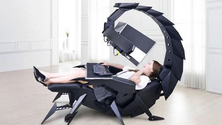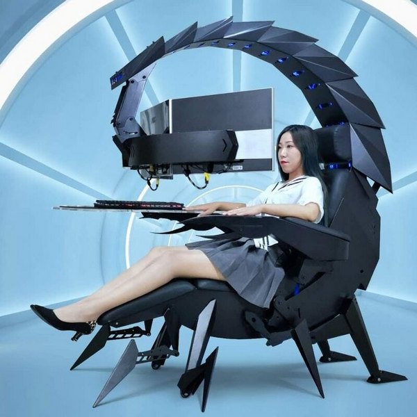 На кончике хвоста гигантского скорпиона до трех 27-дюймовых мониторов или один сверхширокий 49-дюймовый дисплей. Компания утверждает, что кресло может раскладываться на 170 градусов. Угол и расстояние до монитора регулируют с помощью автоматизированного управления.