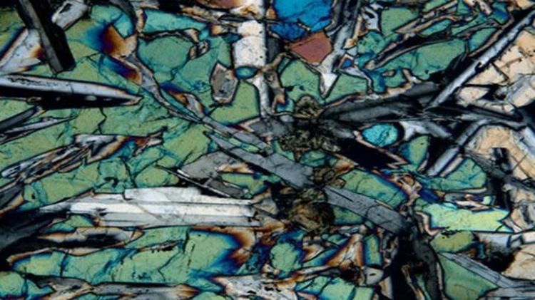 Тем не менее обнаруженный базальт отличается от известных разновидностей так, как если бы ученые сравнивали камни на Земле и на Луне например. Под микроскопом поперечное сечение камня напоминает изображение в калейдоскопе. На фото видно много зеленых и серых оттенков.