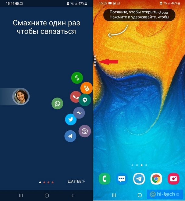 Приложение Drupe собирает все ваши контакты в один удобный интерфейс и позволяет движением пальца отправить сообщение собеседнику в нужном мессенджере. Drupe всегда под рукой, так как располагается поверх других приложений в виде четырех точек в левой части экрана.