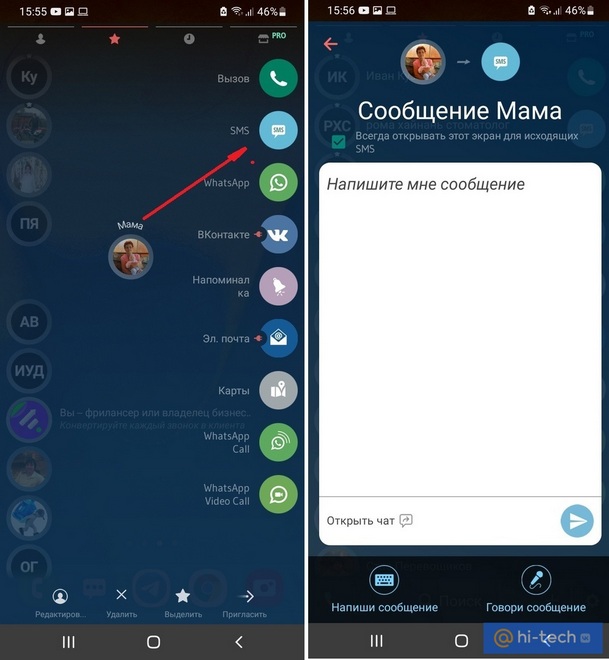 Если нажать на фотографию контакта, то DM Me сразу предложит на выбор мессенджеры, которые используете вы и ваш собеседник. Для комфортного общения контакты можно перемещать в избранные, чтобы они всегда находились вверху списка.