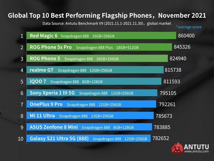Еще интересно, что Nubia Red Magic 6 Pro, даже будучи оснащенным процессором Snapdragon 888, превосходит занявший второе место ROG Phone 5S Pro, который работает на улучшенной версии чипсета — Snapdragon 888 Plus. На третьей позиции обосновался еще один представитель линейки ROG Phone 5.
