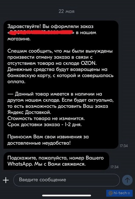 Мошенник связывается с пользователем, извиняется за сорванную сделку и предлагает купить тот же товар не через сервис Ozon, а через ссылку, ведущую на сторонний ресурс. Дальнейшее общение уговаривают перенести в мессенджер.
