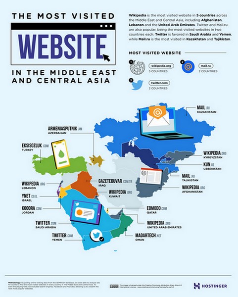Аналитики Hostinger определили и нанесли на карту самые посещаемые веб-сайты на планете. Для Кыргызстана — это Wikipedia. Правда, из подсчетов пришлось удалить Facebook и YouTube, поскольку в противном случае они бы доминировали в результатах.