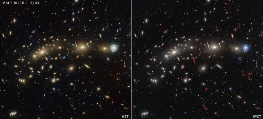 Так телескопы «Уэбб» и «Хаббл» снимают отдельно друг от друга. Слева — снимок скопления галактик MACS0416 в видимом «Хабблу» оптическом свете, справа — в инфракрасном от «Уэбба».