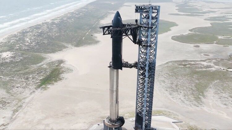 SpaceX готовится к четвертому испытательному полету своей ракеты Starship. На этой неделе первую ступень установили на ракету-носитель Super Heavy на стартовой установке на площадке в Южном Техасе.