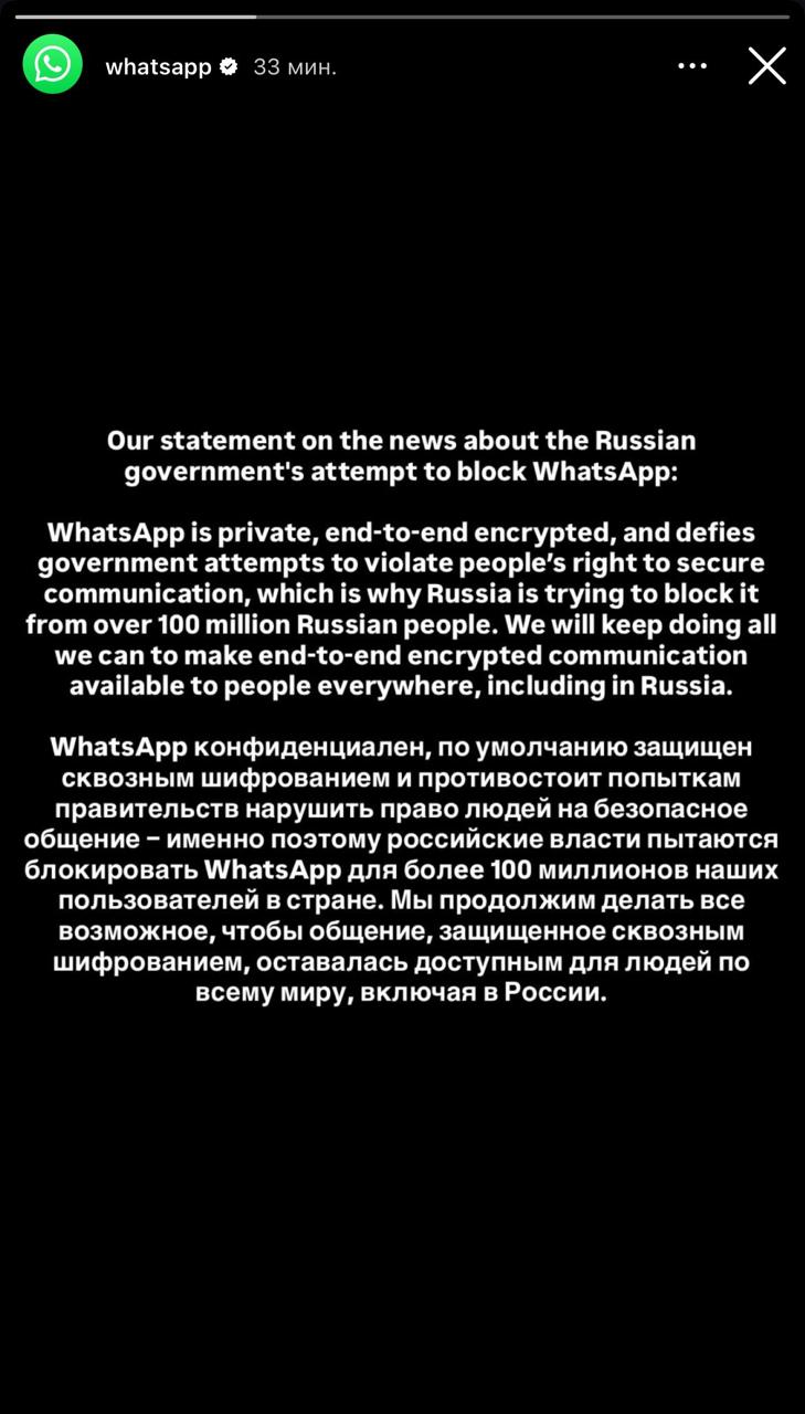 «WhatsApp конфиденциален, по умолчанию защищен сквозным шифрованием и противостоит попыткам правительств нарушить право людей на безопасное общение. Именно поэтому российские власти пытаются блокировать WhatsApp для болee 100 миллионов наших пользователей в стране. Мы продолжим делать все возможное, чтобы общение, защищенное сквозным шифрованием, оставалось доступным для людей по всему миру, включая РФ», — отметили в компании.