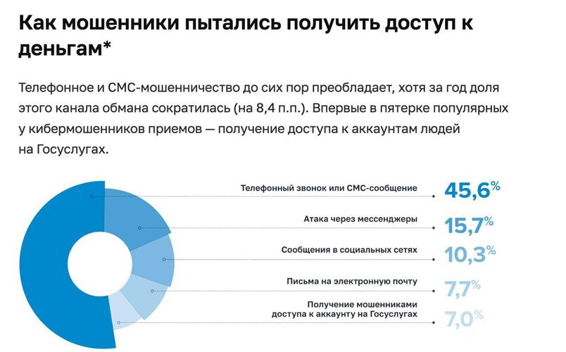 Согласно результатам ежегодного опроса Центробанка РФ, опубликованным в феврале 2025 года, 45,6 процента мошенников использовали сотовую связь и только 15,7 процента атаковали через мессенджеры.