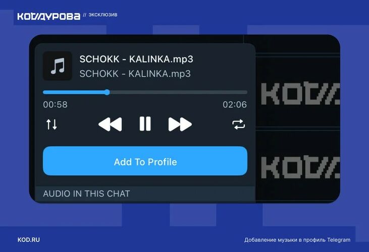 - чтобы добавить музыку, нужно просто отправьте трек в любой чат (даже в «Сохраненные сообщения»), нажать на трек и выбрать «Добавить в профиль»;