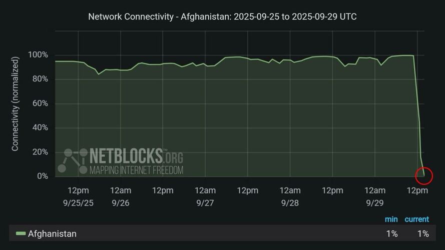 «В Афганистане сейчас наблюдается полное отключение интернета, поскольку «Талибан» предпринимает меры по укреплению морали. Несколько сетей были поэтапно отключены в течение утра; в настоящее время также затронуты телефонные услуги», — говорится в сообщении организации.
