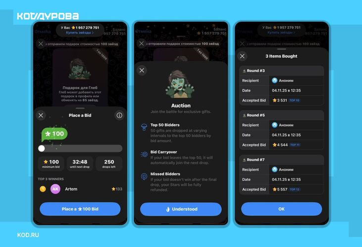 Механизм торгов предполагает, что пользователи, занявшие позиции в Топ-50 по размеру сделанной ставки, получат соответствующую партию подарков. Ставки остальных участников будут перенесены в следующий раунд, где будет разыграна очередная партия. Этот процесс продолжится до тех пор, пока все доступные подарки не будут распределены.