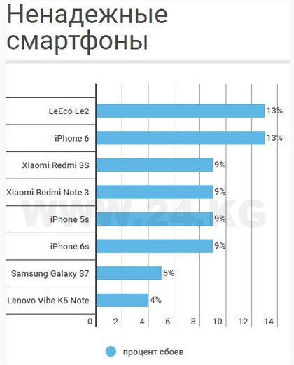В рейтинг самых ненадежных смартфонов на Android также вошли Lenovo Vibe K5 Plus, Motorola Moto G4 и LeEco Le1s.